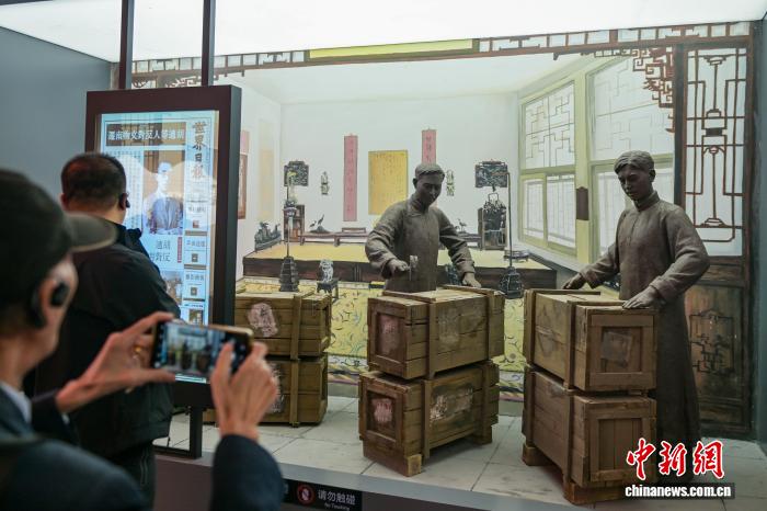 图为复原的故宫文物装箱南迁场景吸引参观者拍照。中新社记者 刘忠俊 摄