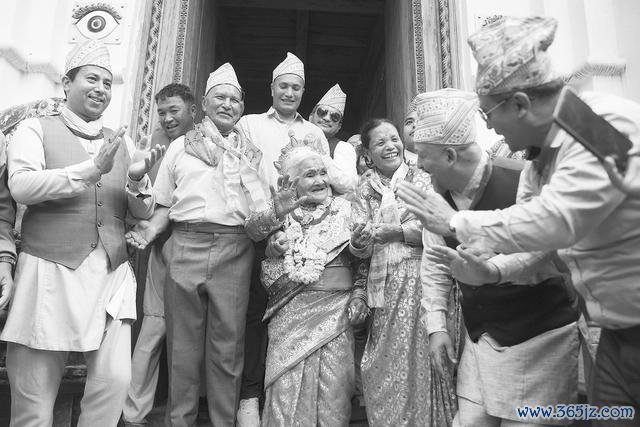 4月18日,尼泊尔加德满都,105岁5个月5天的玛玛·玛雅·马哈尔詹(中)在第五次“詹库仪式”上随着传统音乐起舞。仪式旨在庆祝老人达到高寿里程碑,反映了当地的长寿文化风俗。(视觉中国)